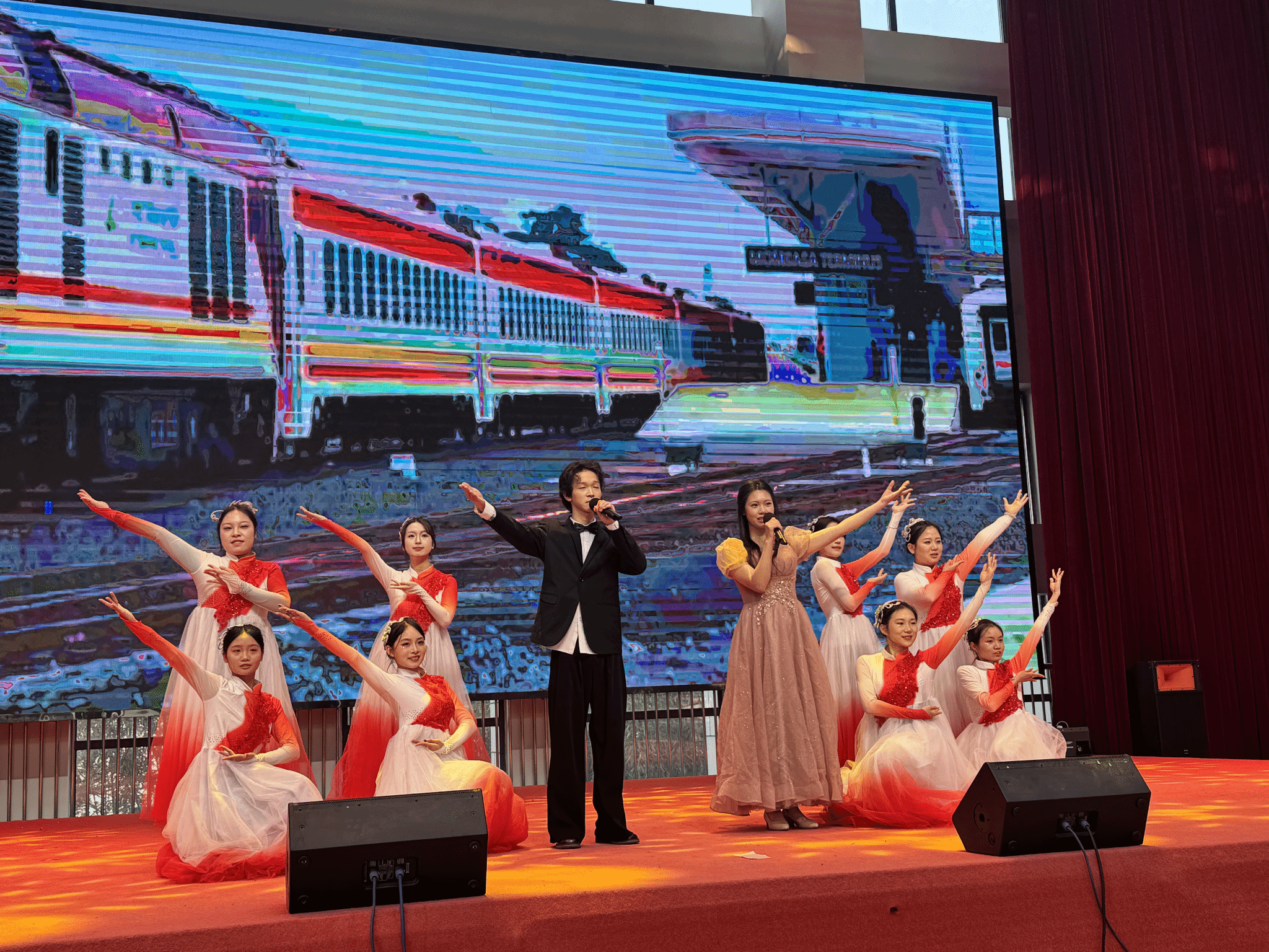 在“团结奋进 再谱华章”篇章,文法学院红色故事英语宣讲队(指导老师:刘丰琴)与红色班级(班主任:徐辉)代表共同合唱《我和我的祖国》,以歌声礼赞祖国、致敬时代,为整场演出画上圆满句号。