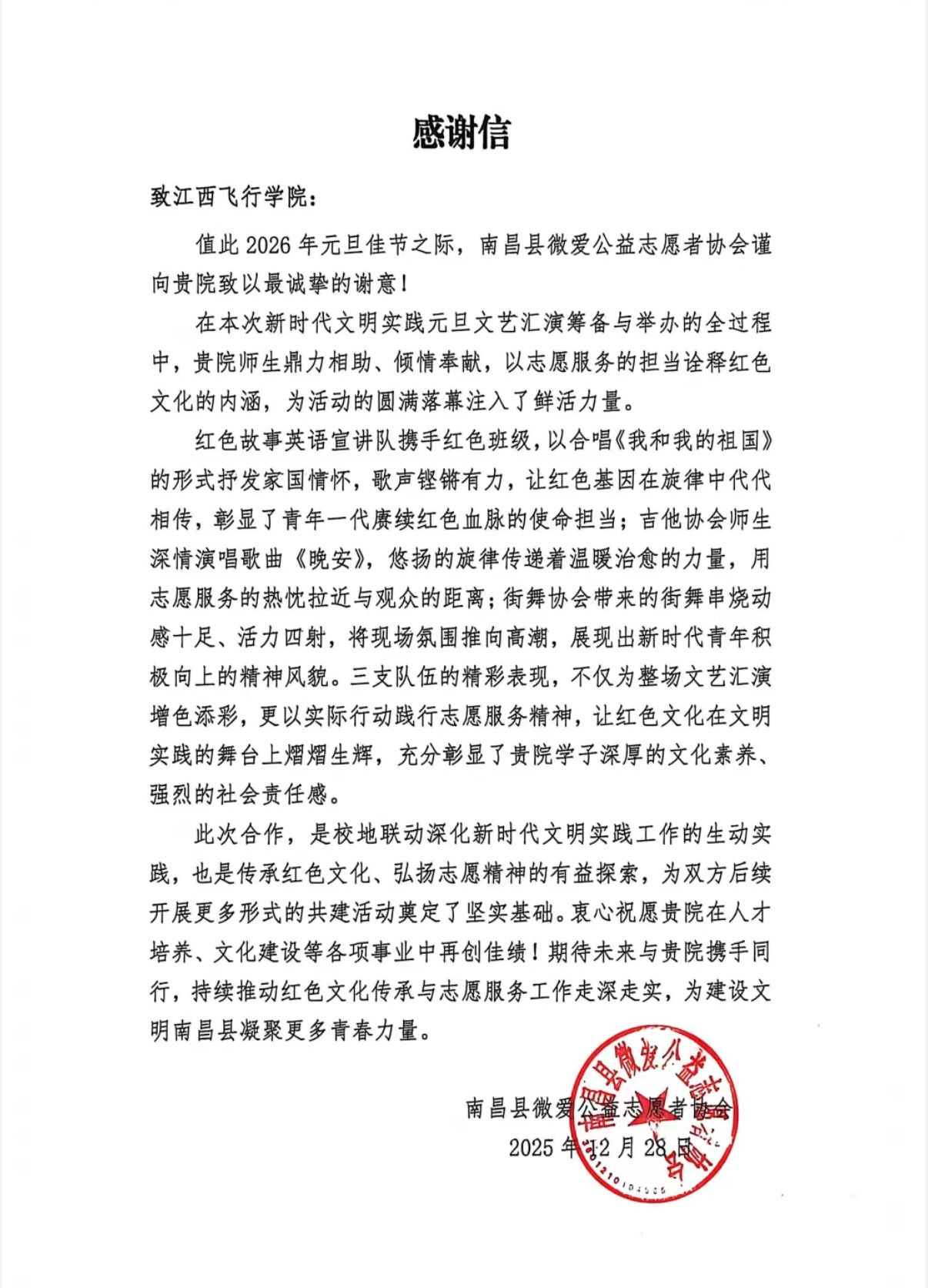 12月27日下午,2026年元旦新时代文明实践文艺汇演暨文明共建活动在南昌县莲塘第一中学举行。本次汇演以“文明共筑新程梦,公益共会暖岁章”为主题,由南昌县新时代文明实践中心主办,莲塘第一中学与南昌县微爱公益志愿者协会承办,江西飞行学院等多家单位共同协办。江西飞行学院文法学院院长林芸带队,组织社团代表、红色故事英语宣讲队及红色班级师生参加了演出。
