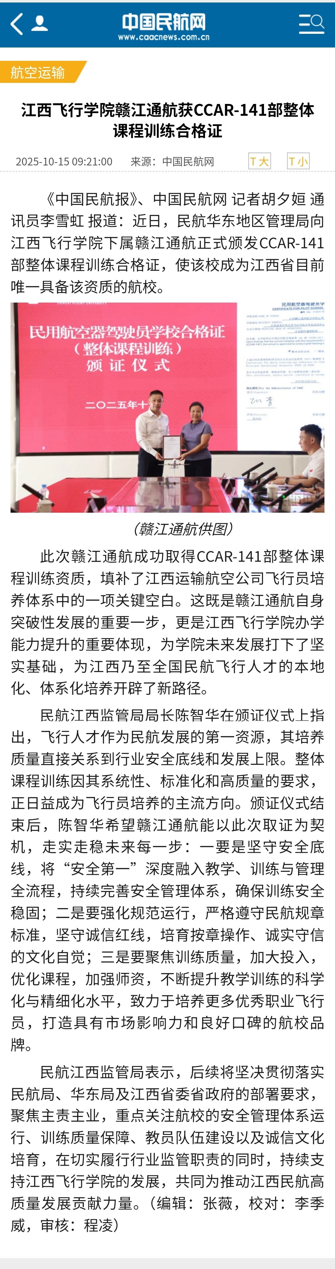 近日,中国民航网报道,江西飞行学院赣江通航获CCAR-141部整体课程训练合格证详情如下: