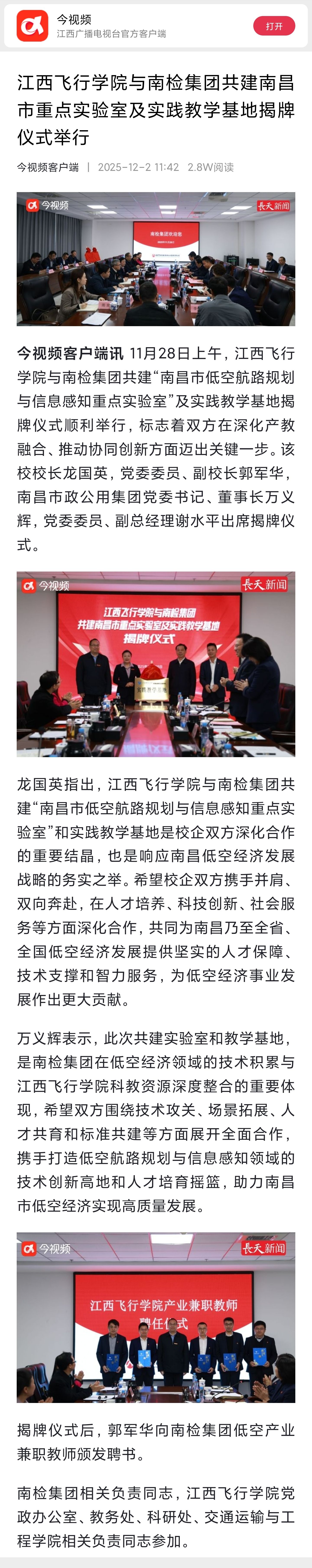 近日,今视频报道,江西飞行学院与南检集团共建南昌市重点实验室及实践教学基地揭牌仪式举行详情如下: