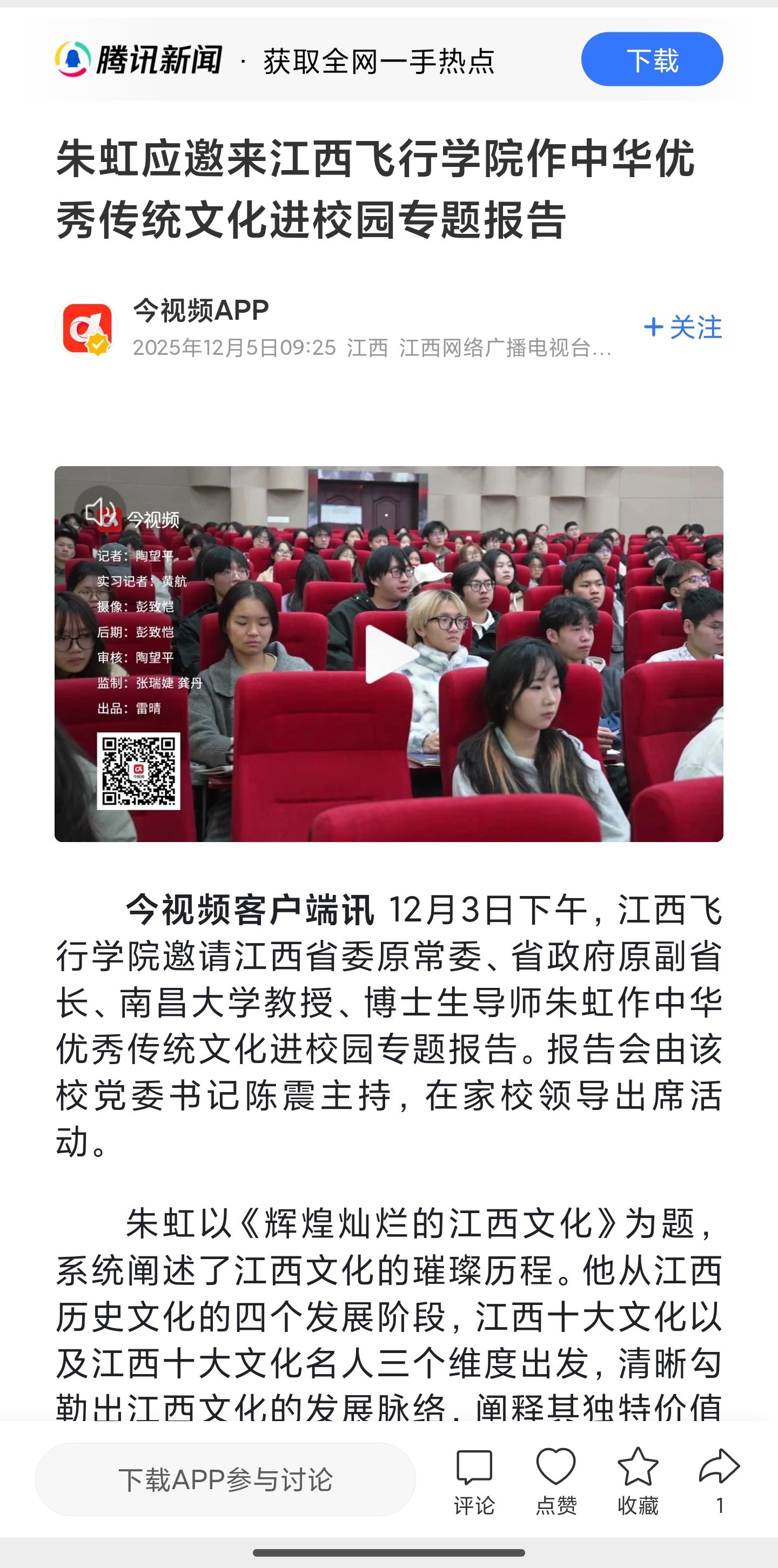 近日,腾讯网报道,朱虹应邀来江西飞行学院作中华优秀传统文化进校园专题报告详情如下