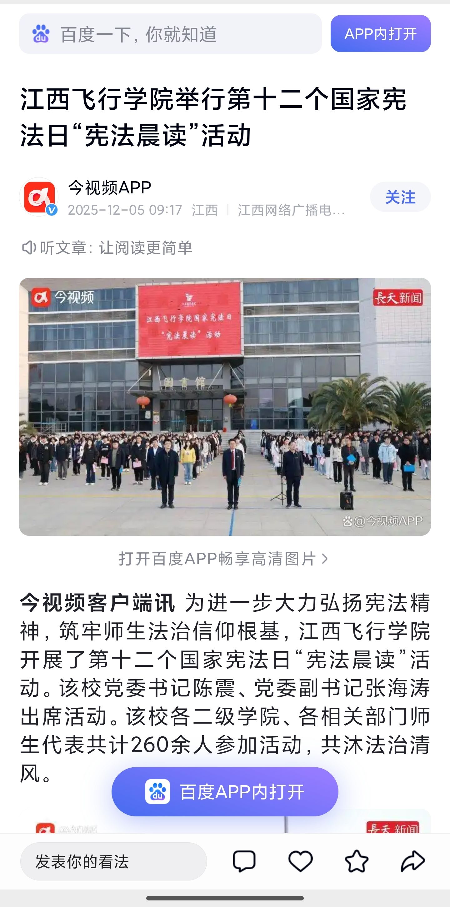 近日,百度报道,江西飞行学院举行第十二个国家宪法日“宪法晨读”活动详情如下