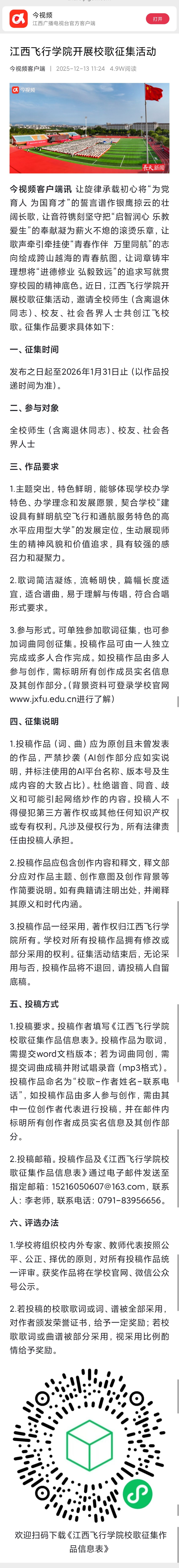 近日,今视频报道,江西飞行学院开展校歌征集活动详情如下: