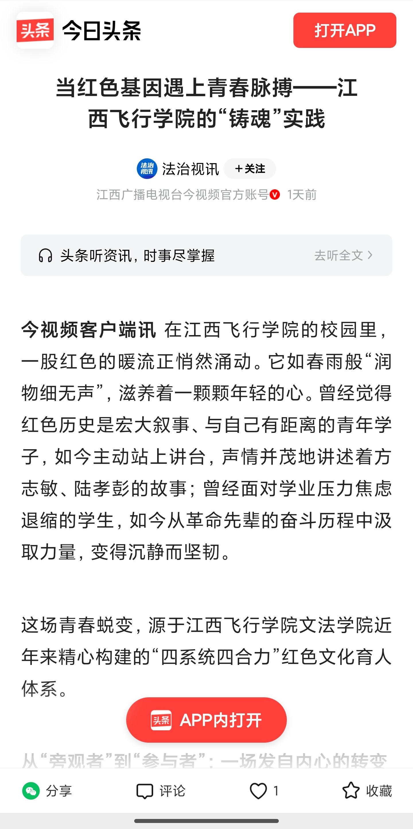 今日头条:江西飞行学院开展当红色基因遇上青春脉搏——江西飞行学院的“铸魂”实践