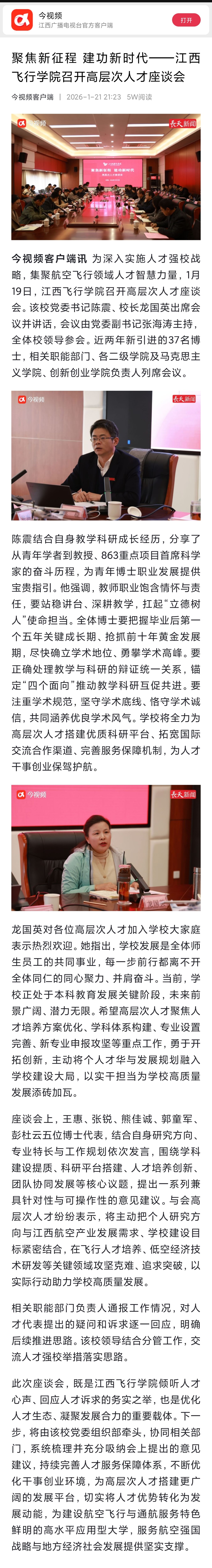 近日,今视频报道,聚焦新征程 建功新时代——江西飞行学院召开高层次人才座谈会详情如下: