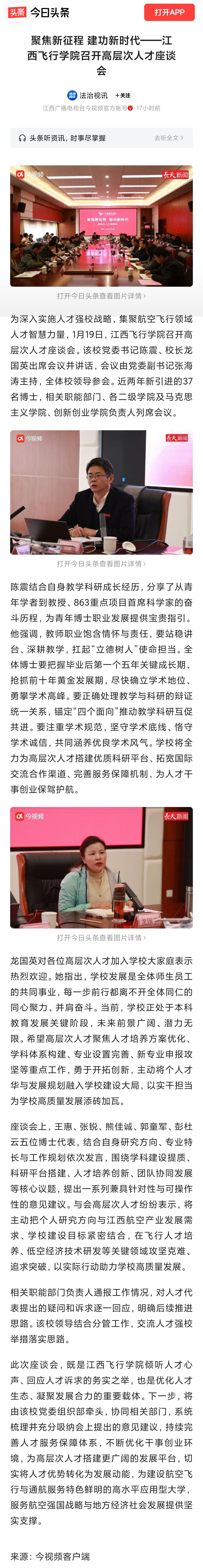 近日,今日头条报道,聚焦新征程 建功新时代——江西飞行学院召开高层次人才座谈会详情如下