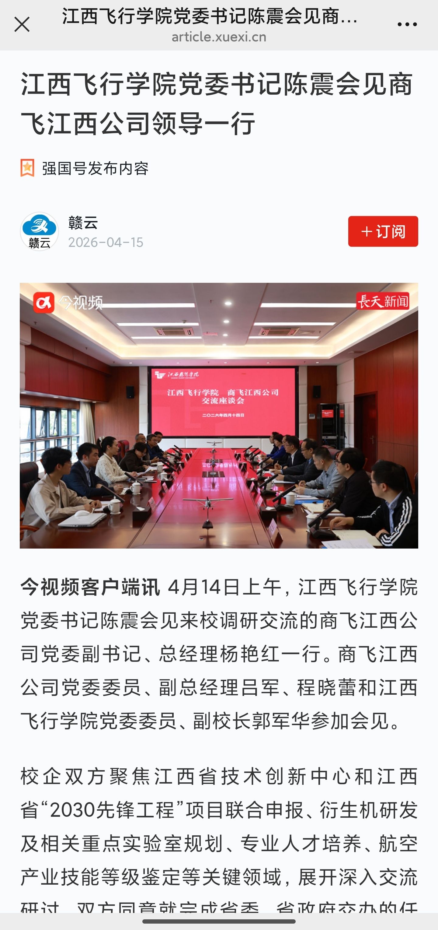 近日,学习强国报道,江西飞行学院党委书记陈震会见商飞江西公司领导一行详情如下: