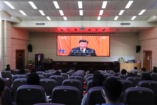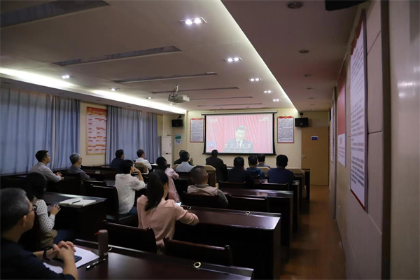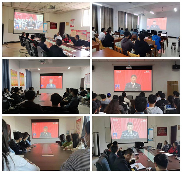 党委书记潘晓华,党委副书记、校长秦夏明,党委委员、副校长肖鸿晶、吴猛强,各机关处室代表在综合楼四楼会议室集中收看,团干教师、学生代表在一教学术报告厅集中收看,各二级学院、其他机关工作人员通过各种方式收看。