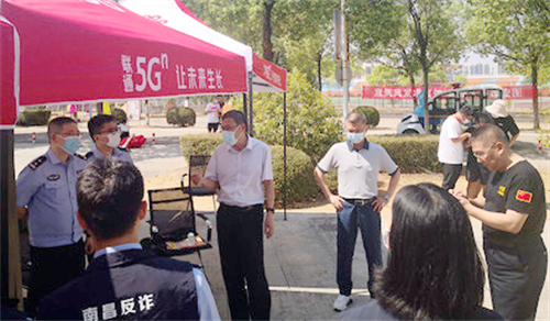 活动开展前,党委书记潘晓华,分管领导党委委员、副校长吴猛强亲临现场看望来校进行反诈宣传的南昌市公安局反诈中心、宣传处和驻地红角洲派出所全体警官,并就反诈防骗工作进行交流探讨。