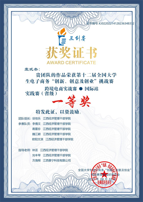 第十二届全国大学生“创新、创意及创业”挑战赛跨境电商实战赛道于2021年12月15日开始启动,包含阿里国际站、eBay、跨境直播、独立站四个赛道(近万支队伍)。其中,我校文法学院商务英语专业(跨境电商方向)学生(谈佳乐、李倩文、蒋蔓珍、魏江颖、欧阳文淇)组成的“壹贰叁”团队参加阿里国际站赛道,经过长达7个月的比拼,在比赛中荣获第十二届全国大学生电子商务“创新、创意及创业”挑战赛跨境电商实战赛·国际站实践赛(省级)一等奖,指导老师林芸、刘丰琴、方海根获得优秀指导老师称号,为学校赢得了荣誉。