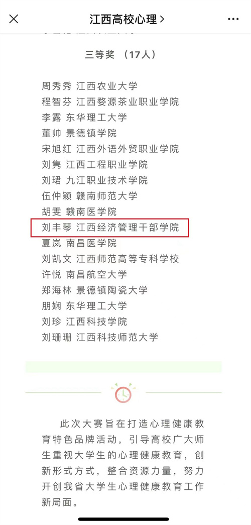 7月8日,省委教育工委、省教育厅主办,江西财经大学承办的江西省第二届高校心理健康教育教师职业能力大赛圆满落幕,来自全省64所高校共82名心理健康教育教师同台竞技,展现了精湛的教学能力和高超的咨询水平。经过激烈的角逐,学校教师刘丰琴荣获三等奖。