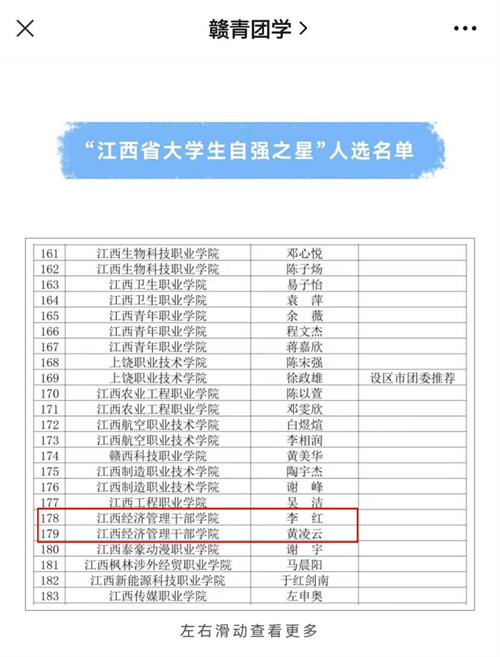 近日,2021年度“江西省大学生自强之星”评选结果出炉,学校电子与信息工程学院2019级电子与商务专业1班学生李红、文法学院2020级法律事务专业1班学生黄凌云获评2021年度“江西省大学生自强之星”称号。