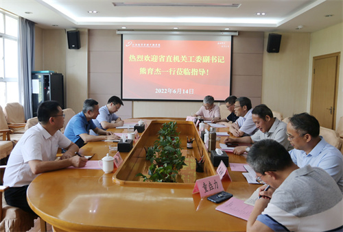 2022年6月14日下午,省直机关工委副书记熊育杰一行3人来校调研指导打造模范机关工作。校党委书记潘晓华,党委副书记、校长秦夏明,以及学校党政办公室、组织人事部、党委宣传部、机关党委负责同志陪同调研,党委委员、副校长吴猛强汇报了学校打造模范机关工作情况。