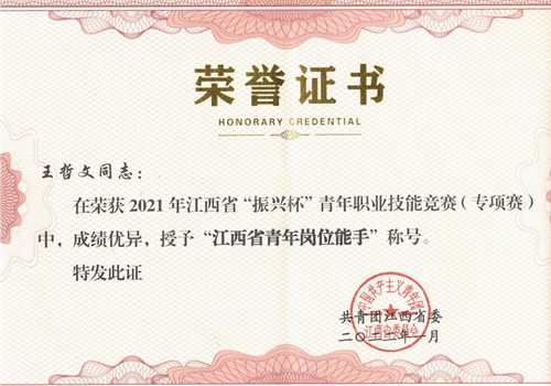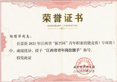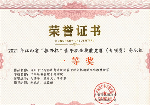 近期,由我校教师邹鹏君、王俊鹏指导的参赛作品“运用于飞行器冷却系统的基于放大机构的压电堆叠微泵”荣获2021年江西省“振兴杯”青年职业技能竞赛(专项赛)高职组一等奖,参赛学生向博洋、王哲文、李晋东被授予“江西省青年岗位职业能手”称号。
