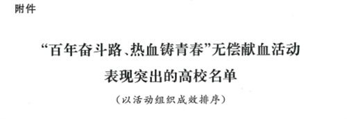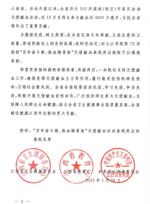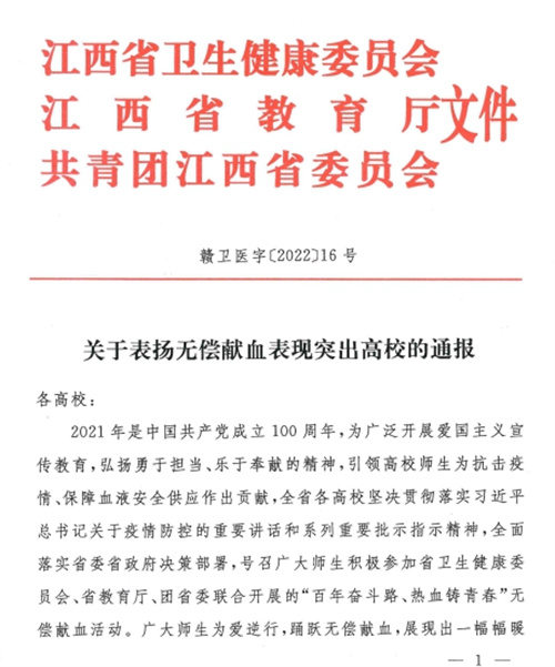 近期,学校收悉省卫生健康委员会、省教育厅、共青团江西省委联合发布《关于表扬无偿献血表现突出高校的通报》。学校在2021年“百年奋斗路,热血铸青春”无偿献血活动中,被评为表现突出的高校。