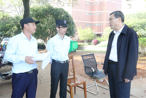 3月15日,学校疫情防控领导小组组长、党委书记潘晓华督导检查校园疫情防控工作,党委委员、副校长衷敬华,党政办公室、保卫处、总务处等有关部门同志陪同检查。