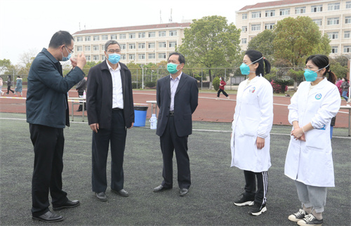 大清早,学校后勤人员顺利完成现场布置工作,共设十组检测通道。