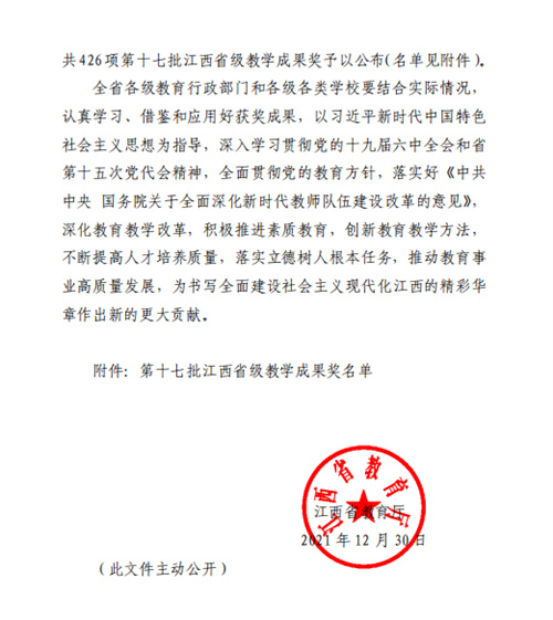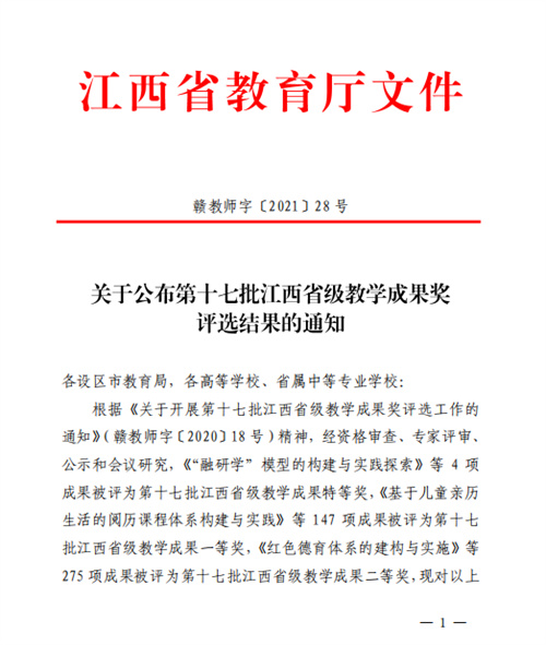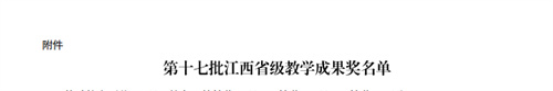近日,江西省教育厅印发《关于公布第十七批江西省级教学成果奖评选结果的通知》,经资格审查、专家评审、公示和会议研究,我院文法学院黄河、林芸、高莉、徐蕾、金阗等同志的《课程思政视阈下“三维联动,德技并修” 大学英语“金课”探索与实践》荣获第十七批江西省级教学成果文化艺术大类二等奖。