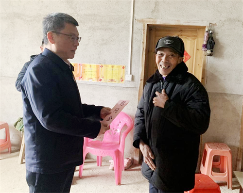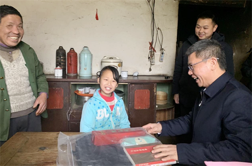 吴猛强一行对村里的困难老党员、脱贫户、监测户和留守儿童进行了慰问。脱贫户邓锡达是一位党龄58年的老党员,吴猛强与他聊起了家常,关心他的家庭收入情况,并代表学院向他送去了新春祝福和慰问金,邓锡达非常感谢组织关心,表示会继续发挥党员的模范带头作用,为桃源村的发展贡献自己的一份力量。吴猛强代表学院给留守儿童邓雨欣和曾雅芳送去了书包、文具、红色读物和慰问金,并嘱咐她们要好好学习,树立远大的理想,成为国家的栋梁之才。