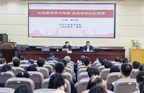 12月22日,学院举办党章党规党纪培训班,省委党校二级巡视员潘泽林教授应邀作党章学习辅导报告。党委书记潘晓华,党委委员副院长衷敬华、肖鸿晶、熊运儿、吴猛强,院长助理段利兵出席报告会,报告会由吴猛强主持。各党总支(支部)委员、部分学生党员共计百余人参加学习。