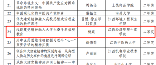 近日,全省教育系统党史学习教育领导小组发布《关于公布学习习近平总书记在庆祝中国共产党成立100周年大会上重要讲话精神理论征文获奖名单的通知》,经单位推荐、知网查重、专家评审等环节,学院思政课教师杨庭撰写的理论文章《浅谈建党精神融入大学生奋斗幸福观教育》脱颖而出,荣获二等奖。