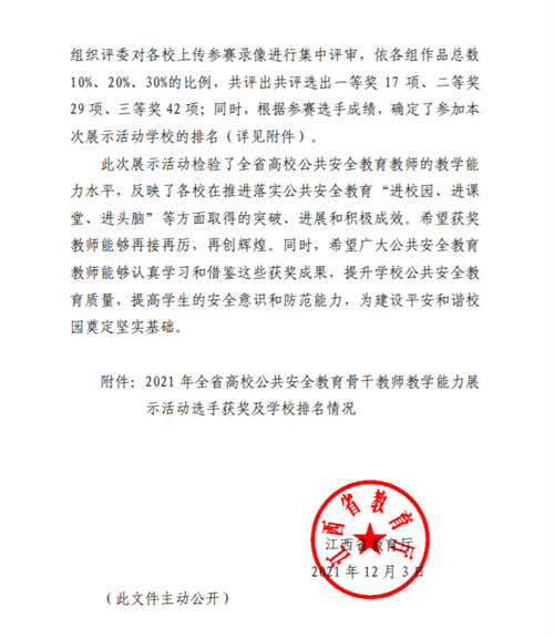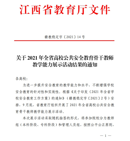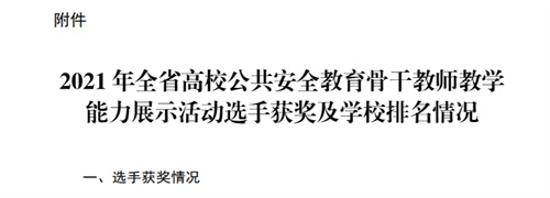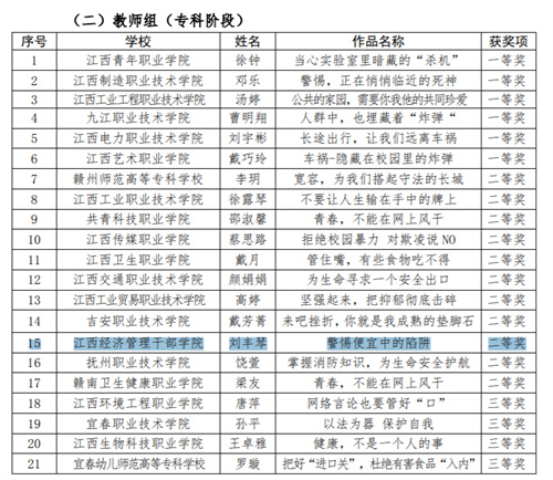 根据省教育厅《关于2021年全省高校公共安全教育骨干教师教学能力展示活动结果的通知》,经组织评审,我院刘丰琴教师的教学作品《警惕便宜中的陷阱》荣获全省高校专科组二等奖。