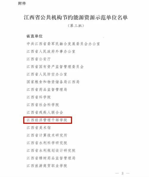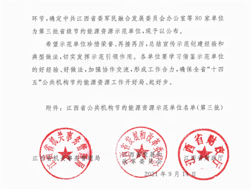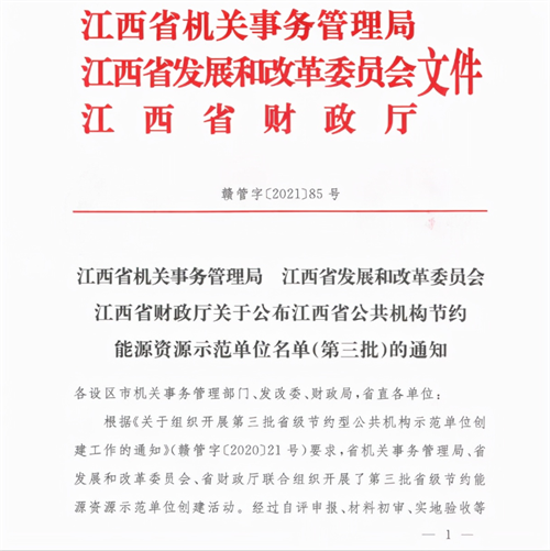 近日,江西省机关事务管理局、江西省发展和改革委员会、江西省财政厅联合印发《关于公布江西省公共机构节约能源资源示范单位(第三批)的通知》,我院名列其中,荣获江西省公共机构节约能源资源示范单位称号。