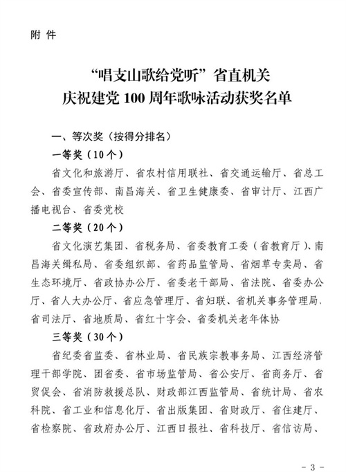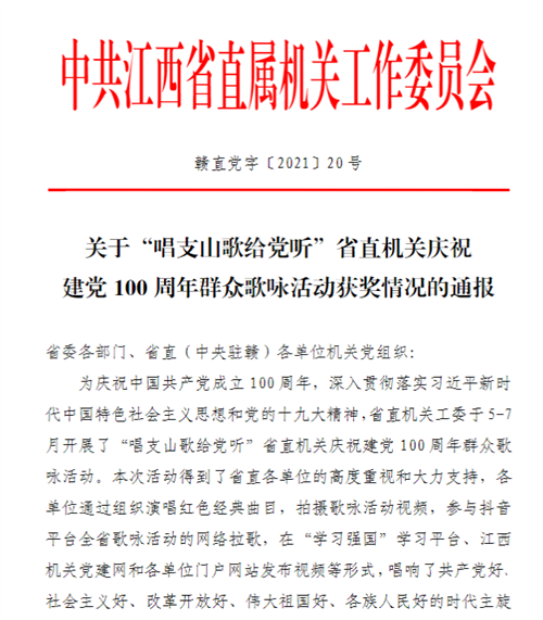 日前,省直机关工委发布《关于“唱支山歌给党听”省直机关庆祝建党100周年群众歌咏活动获奖情况的通报》,学院荣获“唱支山歌给党听”省直机关庆祝建党100周年群众歌咏活动三等奖。