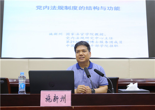 施新州以《党内法规制度的结构与功能》为题,从党内法规建设与推进国家治理体系和治理能力现代化入手,详细讲解了党内法规制度的结构、功能、执行力。施新州全面介绍了十八大以来党内法规制度建设历程、党内法规制度建设基本情况、党内法规制度建设成就和党内法规制度体系的形式构成;从党内治理功能、国家治理功能两个层面,提出必须坚持依法治国与依规治党的有机统一;就学习宣传贯彻《中国共产党普通高等学校基层组织工作条例》,做好新时代高校党建工作提出了意见建议。