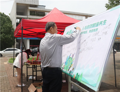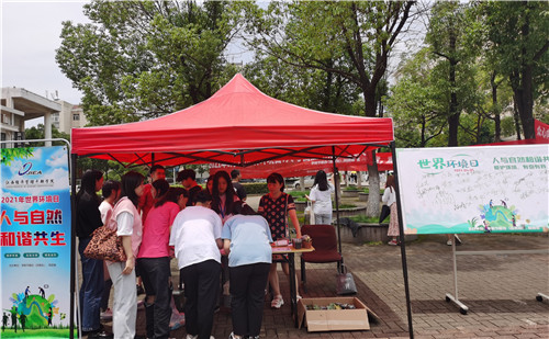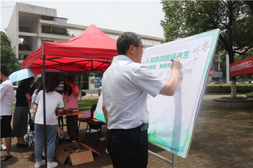 广大师生积极参与现场活动,在横幅或海报签名墙上签名、参加环保知识竞答、转发“世界环境日”环保倡议书微信公众号推文,宣传活动气氛热烈。