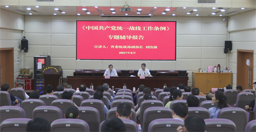 6月18日,学院举行《中国共产党统一战线工作条例》专题辅导报告会。省委统战部副部长刘伟旗应邀作专题辅导报告,学院党委书记主持报告会并讲话。在家院领导、中层干部、各基层党组织统战委员、各民主党派人士,党委统战部全体人员参加学习。