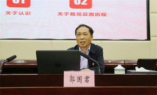 郭国君以《腐败与反腐败—中国共产党百年反腐历程》为题作辅导报告。他深入分析了腐败的客观性、世界性、局限性,系统阐释了腐败存在的原因,腐败的种种表现及根治腐败的艰巨性;并分别从新中国成立前、社会主义革命和建设时期、改革开放和社会主义现代化建设新时期、党的十八大以来四个历史时期系统梳理了我党的反腐败历程、经验作法和取得的成绩。