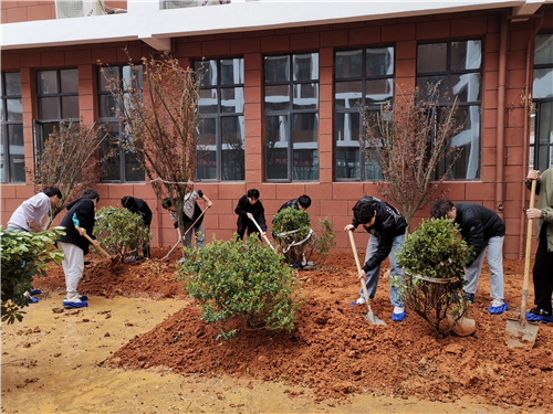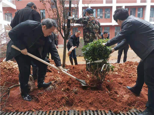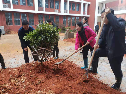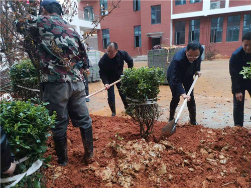 上午8点半,在学院科技楼内庭空地上,学院党委书记潘晓华,党委副书记、院长秦夏明,党委委员、副院长衷敬华、肖鸿晶、熊运儿、林蓉,院长助理段利兵带领师生扶植苗木、挥锄培土,种下了几十株紫叶李和海桐球树苗。