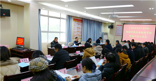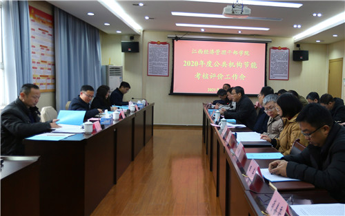 1月5日下午,以省司法厅机关后勤服务中心主任李引发为组长的省公共机构节能考评组来院考核评价2020年节能减排工作。学院在行政楼四楼会议室召开2020年度节能工作汇报会。学院党委书记潘晓华,党委委员、副院长衷敬华,学院节能减排工作领导小组成员及有关工作人员参加会议。