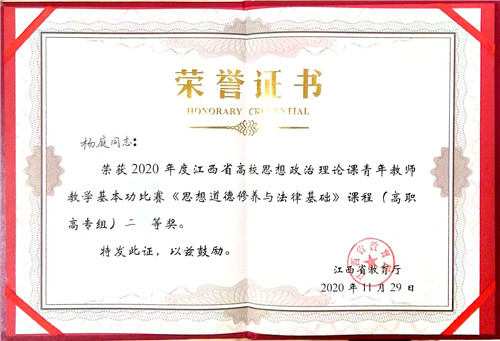 据悉,学院思政部青年教师杨庭在2020年度江西省高校思想政治理论课青年教师教学基本功比赛中荣获《思想道德修养与法律基础》课程(高职高专组)二等奖。