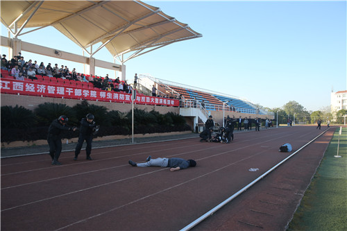 市公安局反诈中心民警利用说唱和迪斯科的形式与师生进行反诈骗宣传互动,增强了师生电信诈骗防范意识。南昌特警支队大院大队进行了刀斧砍杀事件处置和机器人排爆拆弹等精彩演示。市消防救援支队大院大队组织学院消防志愿队员及部分学生进行了火灾逃生及扑救灭火演练。