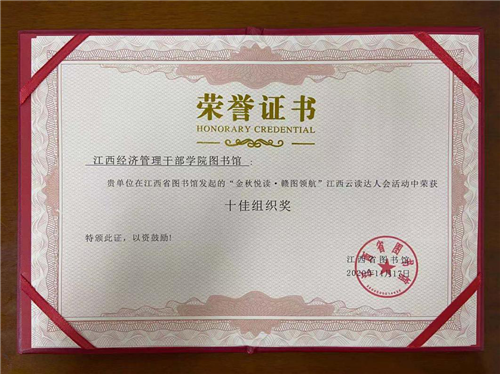 9月27日至10月27日,由江西省图书馆主办,江西省各级公共图书馆、高校图书馆协办的“金秋悦读•赣图领航”江西云读达人会活动成功举行。本次活动中,学院图书馆荣获“十佳组织奖”,191酒店管理班孙晴同学荣获“云读推广优秀奖”。