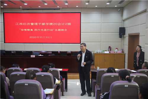 党委书记潘晓华深入会计系202会计班,与同学们一起听讲、做笔记,与同学们分享交流学习经验。在“珍惜粮食 践行光盘行动”主题班会上,他结合自身专业研究领域,为同学们阐释了粮食的基本概念和特殊地位,粮食安全和节约粮食的重要意义等,为同学们上了一堂生动的思政课。同学们听后深受启发,纷纷表示要在日常生活中爱惜粮食,践行光盘行动,为厉行节约贡献力量。