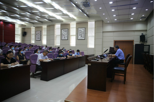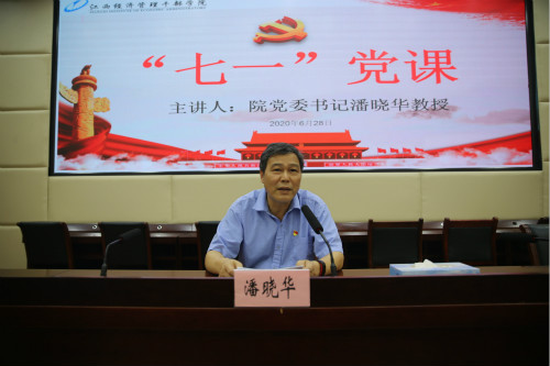 6月28日,学院党委书记潘晓华在一教学术报告厅为会计系党员干部讲授“七一”党课,会计系全体教职工到场聆听。