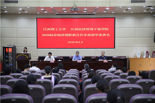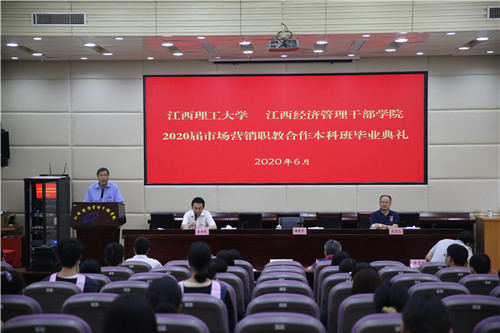 6月18日上午,学院与江西理工大学联合培养的2020届市场营销职教本科班毕业典礼在一教学术报告厅举行。学院党委书记潘晓华出席典礼并讲话,党委委员、副院长熊运儿,组织人事部、教务处、工商管理系负责人、教师代表及全体毕业生参加典礼。