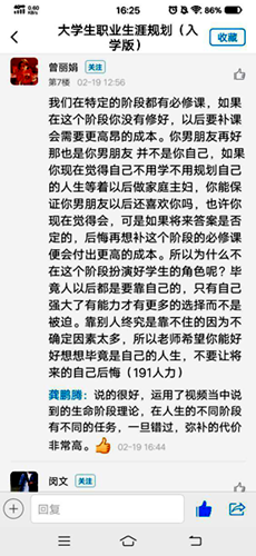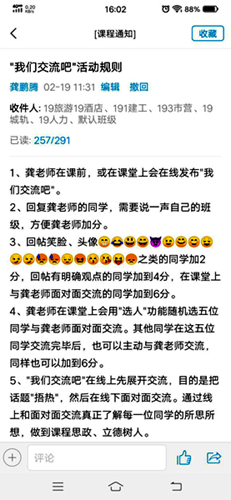 在这一堂堂受欢迎的课程背后,是龚鹏腾的默默付出。他所教授的6个班总共有291名学生,每次与学生在线交流,都要回复上百条消息,可是不管多忙、多晚,他都一一认真解答,直到每位学生满意。有一次,他发现一位学生在回复讨论话题时,内容敷衍、语气很“丧”,龚鹏腾连忙关心询问,学生向他吐露了心中“苦水”,原来“宅”在家里许久让这位学生心情低落,感到焦虑。龚鹏腾顺势邀请这位学生成为微信好友,像朋友一样嘘寒问暖,进行心理疏导,平复了该学生的负面情绪。“作为教师一定要充分尊重和爱护每一位学生。”龚鹏腾以爱与责任的信念,坚守并活跃在特殊时期的教学岗位上,学生们的尊重与信任,是他最有底气的骄傲。
