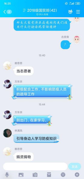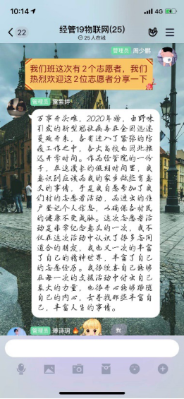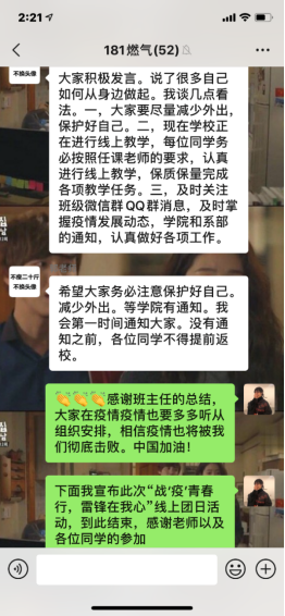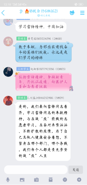 当日,各院系团支部一起重温了《雷锋》《雷锋的微笑》《雷锋在1959》等影片,学习研讨如何通过自己的实际行动让“雷锋精神”在战“疫”中闪光;有的团支部共同致敬“最美逆行者”,学习他们的先进事迹和奉献精神;有的团支部请本班参加当地疫情防控的“最美志愿者”与同学们分享自己的亲身经历,达到了用身边事启发人、教育人、感染人的良好效果。飞行技术学院191无人机班的吴刚同学分享时说:“作为一名疫情防控志愿者,不惧,应是青春的模样,不退,方显青年的担当,我们作为新时代雷锋精神的传承者,要用自己的实际行动为这场战役注入经管力量。”