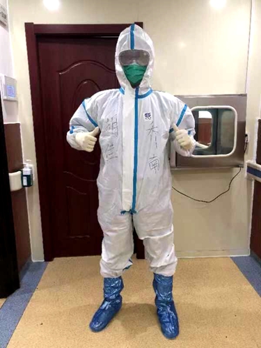 图为乔南同志爱人胡佳医生进入江西省中医院隔离区前。