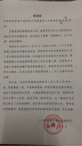 叮叮叮...工作群里又热闹了起来,这次却不太一样,大家不是在汇报情况,而是纷纷发送点赞的表情包。大家点赞的内容是一封表扬信!这封信来自八月湖街道办事处,专门表扬了学院工商管理系18级人力资源管理班学生刘洋。