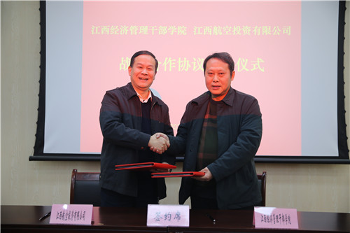 座谈会后,秦夏明与王正文签订了学院与江西航空投资有限公司签订战略合作协议。