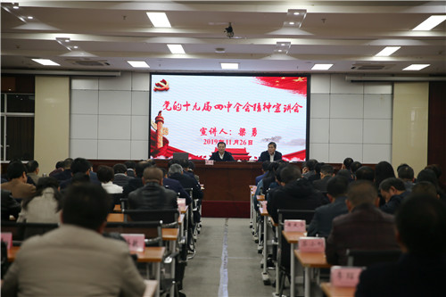 11月26日下午,学院邀请省委宣讲团成员、江西省社会科学院党组书记、院长梁勇来院作党的十九届四中全会精神宣讲报告。学院党委书记潘晓华主持宣讲会,在家院领导、全院正处级干部、学院宣讲团成员及第19期市厅班、第36期县处班和第4期乡镇班学员共200余人聆听了宣讲报告。