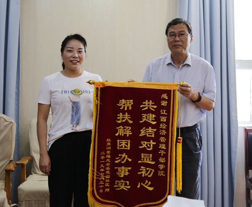 丁秋云就学院为云溪花园社区给予的帮扶表示感谢,并代表云溪花园社区全体居民向学院赠送 “共建结对显初心 帮扶解困办事实”锦旗。