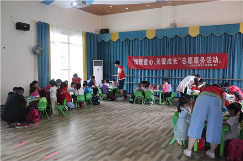 6月27日,院团委组织学生入党积极分子和学生代表等前往红谷滩云溪幼儿园开展公益活动。志愿者们拿着提前准备好的书包及文具发放给留守儿童和家庭困难的小朋友。社团联合会美术协会、DIY手工协会和弘弈棋社的志愿者们分成三组教小朋友绘画、手工折纸和下棋,现场的孩子们积极参与,兴趣浓厚,气氛热烈。