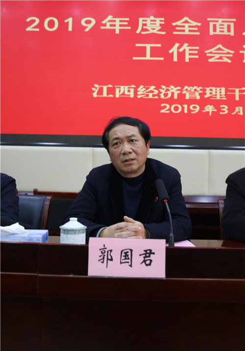 郭国君围绕贯彻落实十九届中央纪委三次全会和省纪委十四届四次全会精神,结合学院实际,对学院2019年全面从严治党工作提出要求:一要从更高处认识全面从严治党形势,充分认识到全面从严治党取得的卓著成效、面临的严峻复杂形势、担负的使命任务,进一步强化责任担当;二要从更深处整治“四风”问题,落实中央八项规定精神,扭住整治形式主义、官僚主义不放,精准突出整治重点,切实转变作风;三要从更实处把监督挺在前面,做到监督的责任要实、方式要实、内容要实,形成监督合力;四要从更严处执纪惩腐,巩固反腐败压倒性胜利,以永远在路上的执着和坚韧推进全面从严治党、党风廉政建设和反腐败斗争工作,构建经管学院政治上的绿水青山。