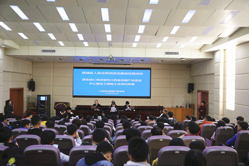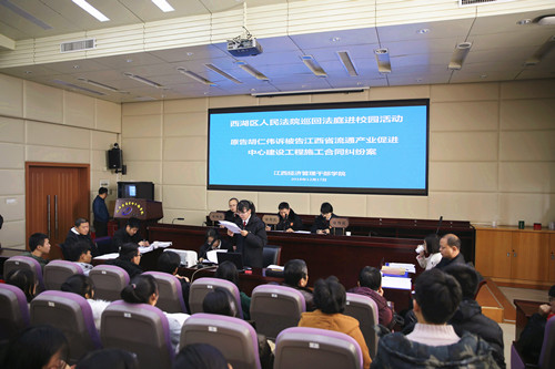 12月17日下午,学院邀请了西湖区人民法院来院开展“巡回法庭进校园”活动。西湖区人民法院桃花法庭的黄迁、陶然、陈志强三位法官组成合议庭,审理了“原告胡仁伟诉被告江西省流通产业促进中心建设工程施工合同纠纷案”。全院各系师生共120余人观摩了本次庭审活动。